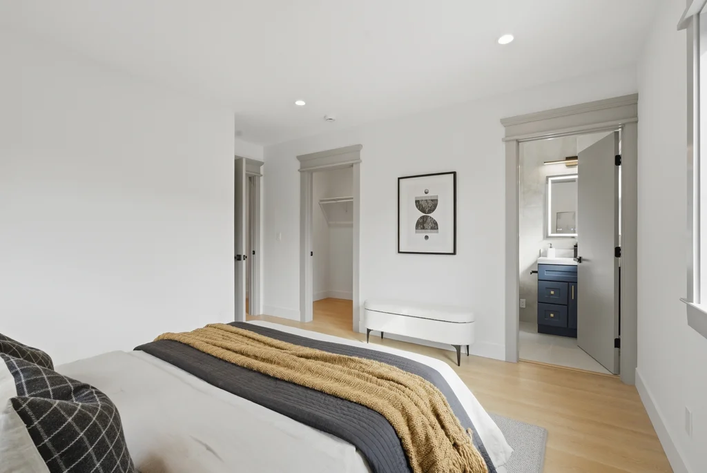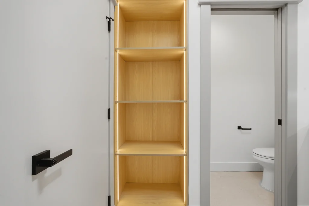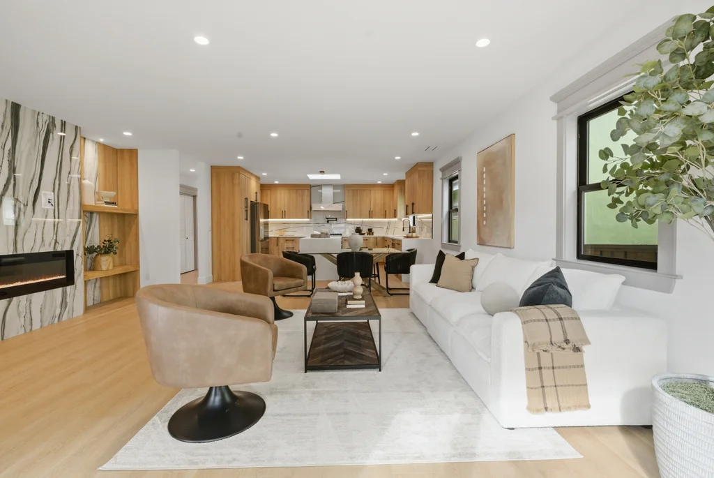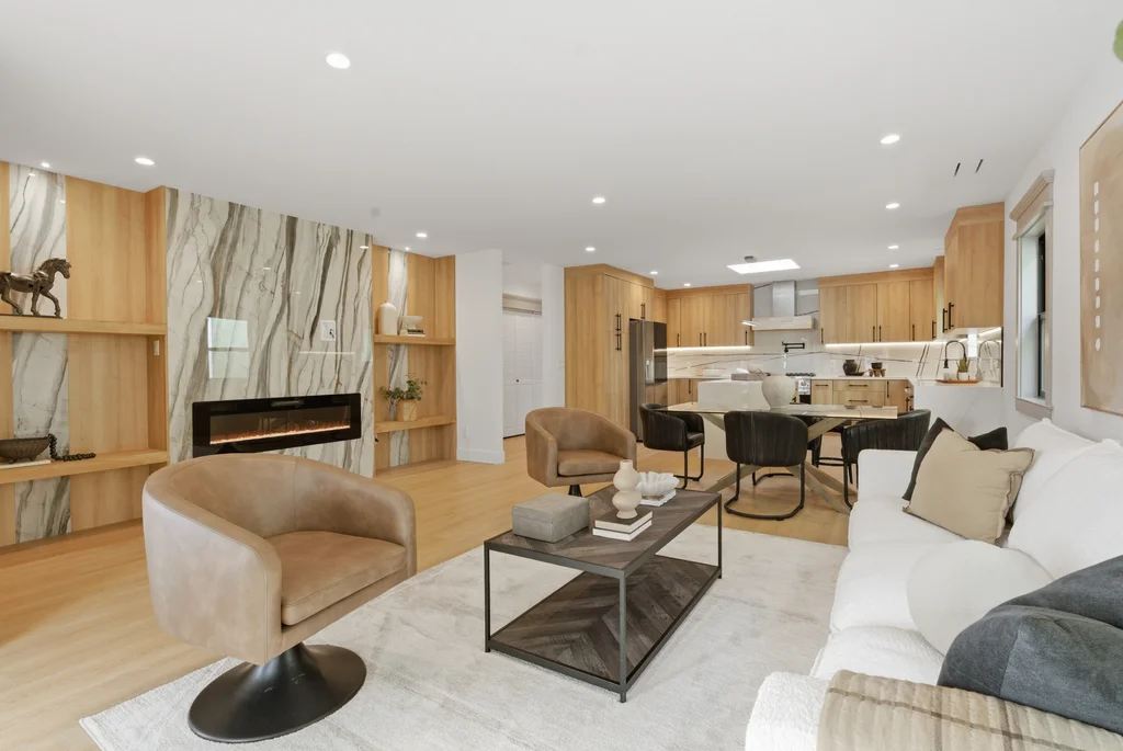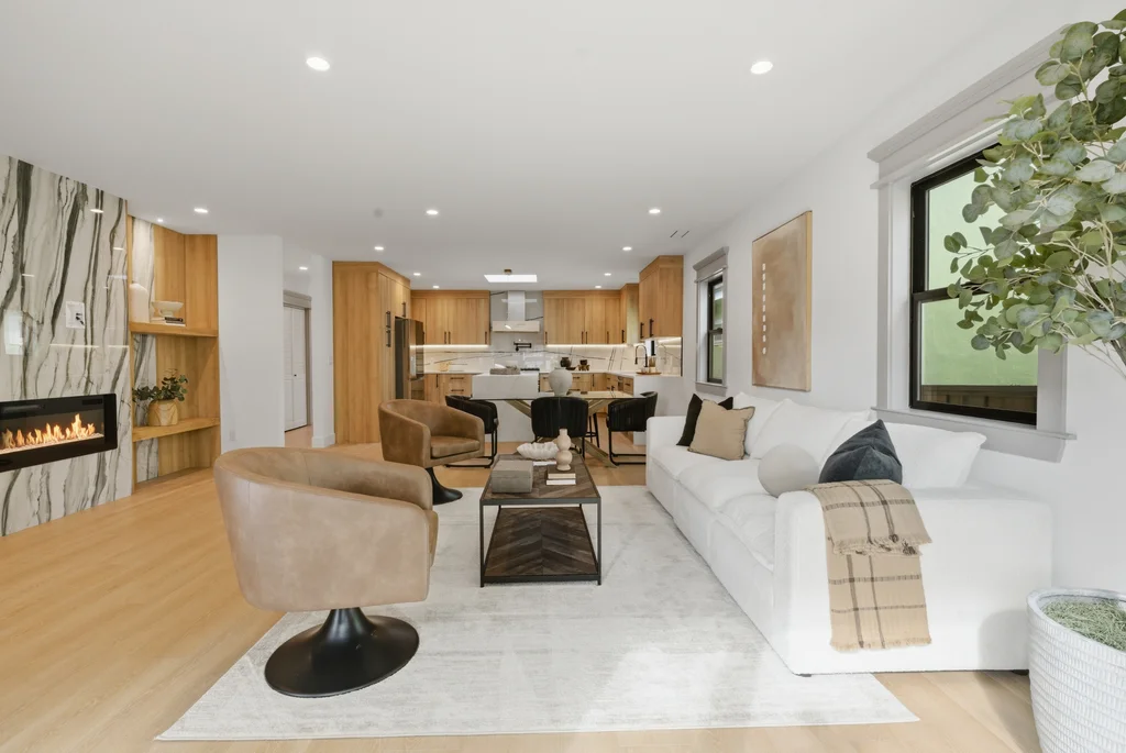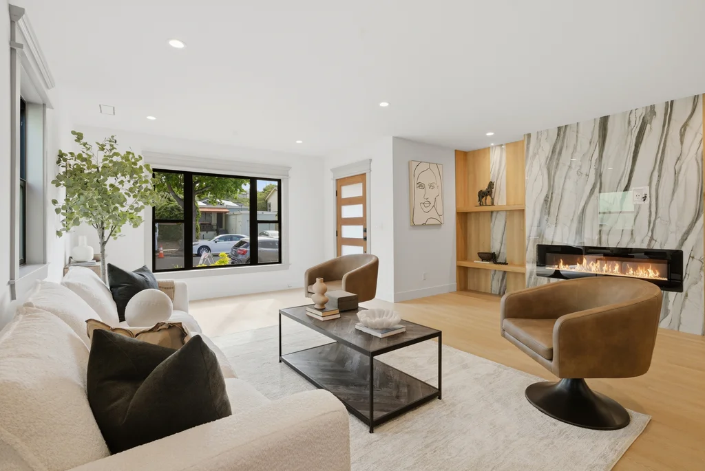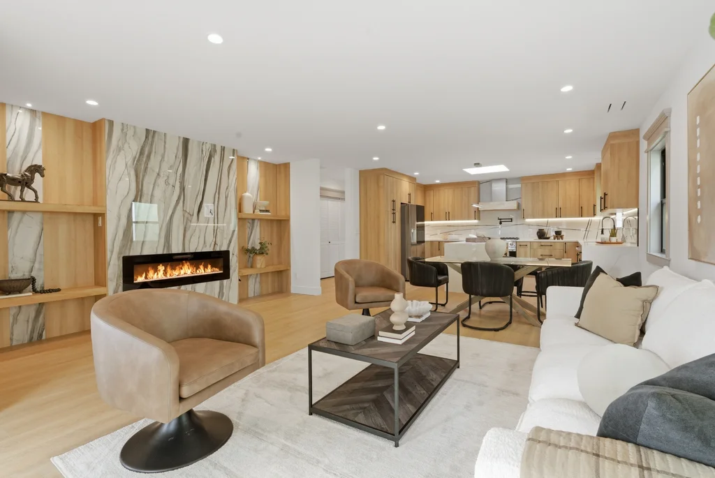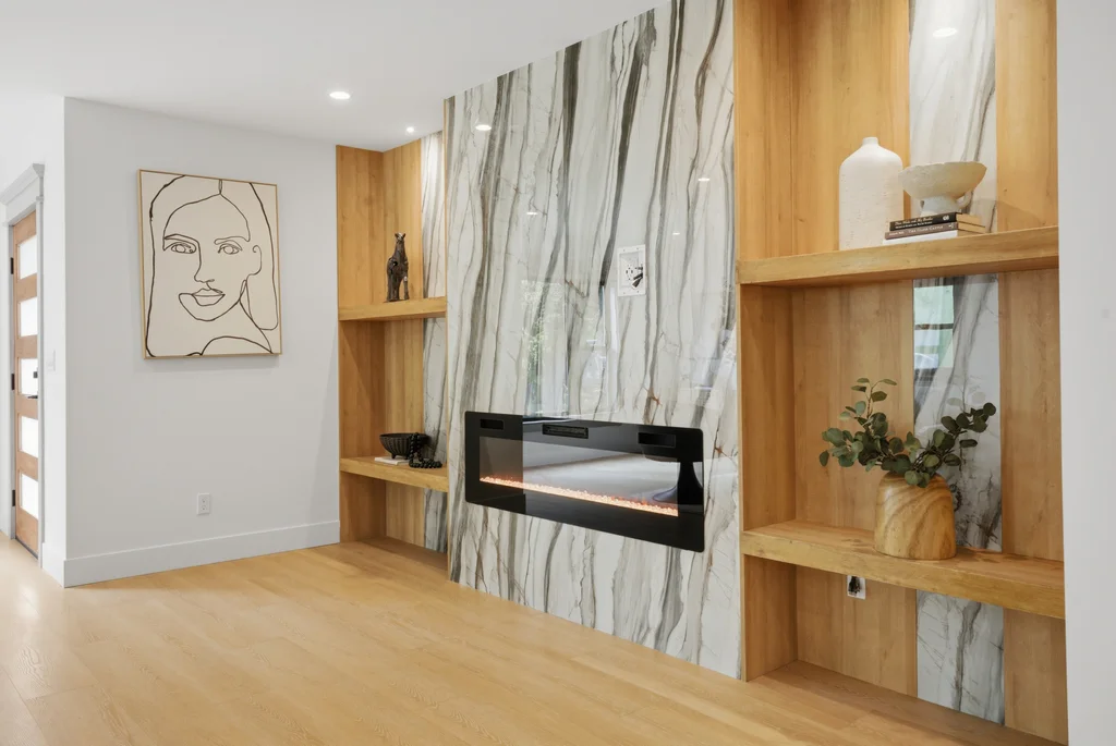 Step inside to discover a bright, welcoming interior enhanced by wide-plank SPC flooring, recessed lighting, and smart-home features, including a smart thermostat for year-round efficiency and comfort. The living space is anchored by a stunning electric fireplace wrapped in an elegant Italian porcelain slab, creating a sophisticated focal point that blends warmth, texture, and contemporary design.