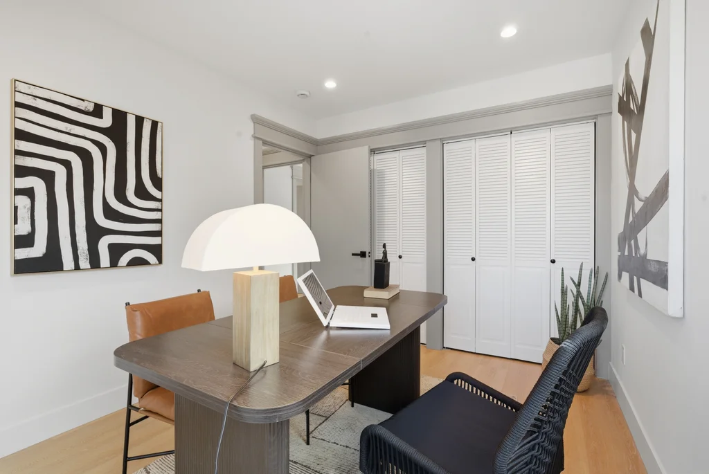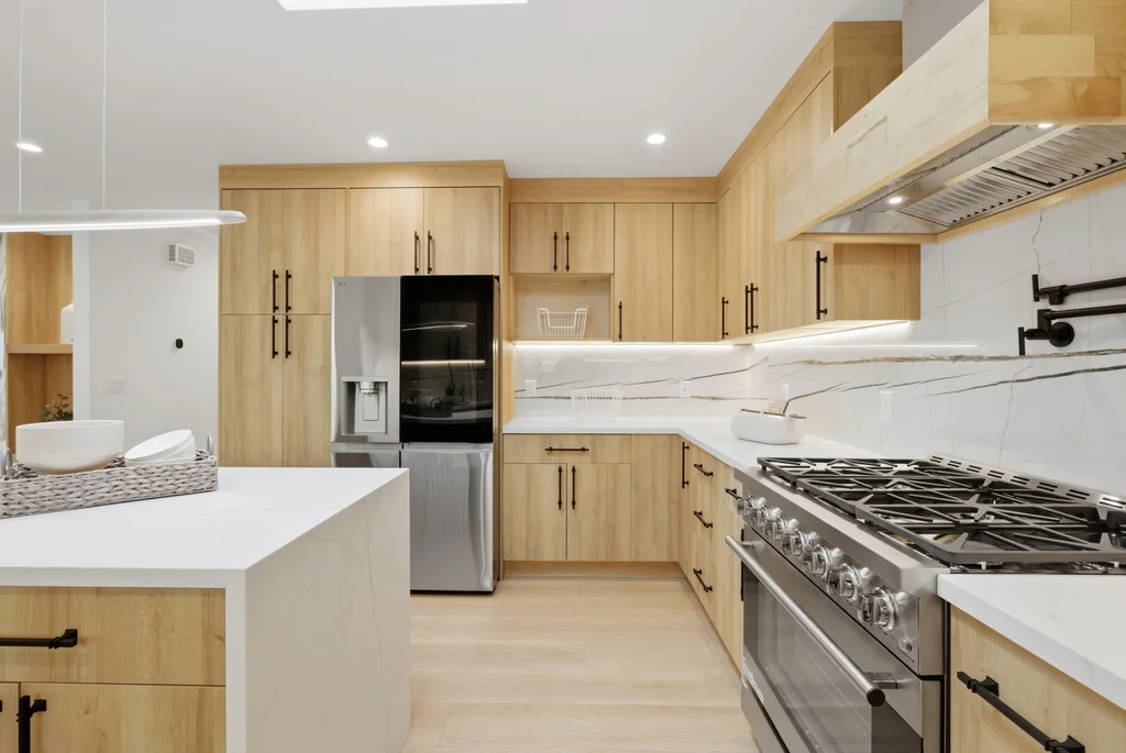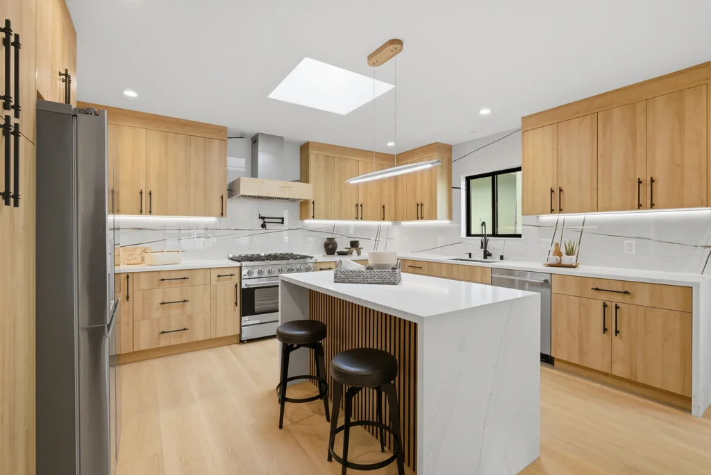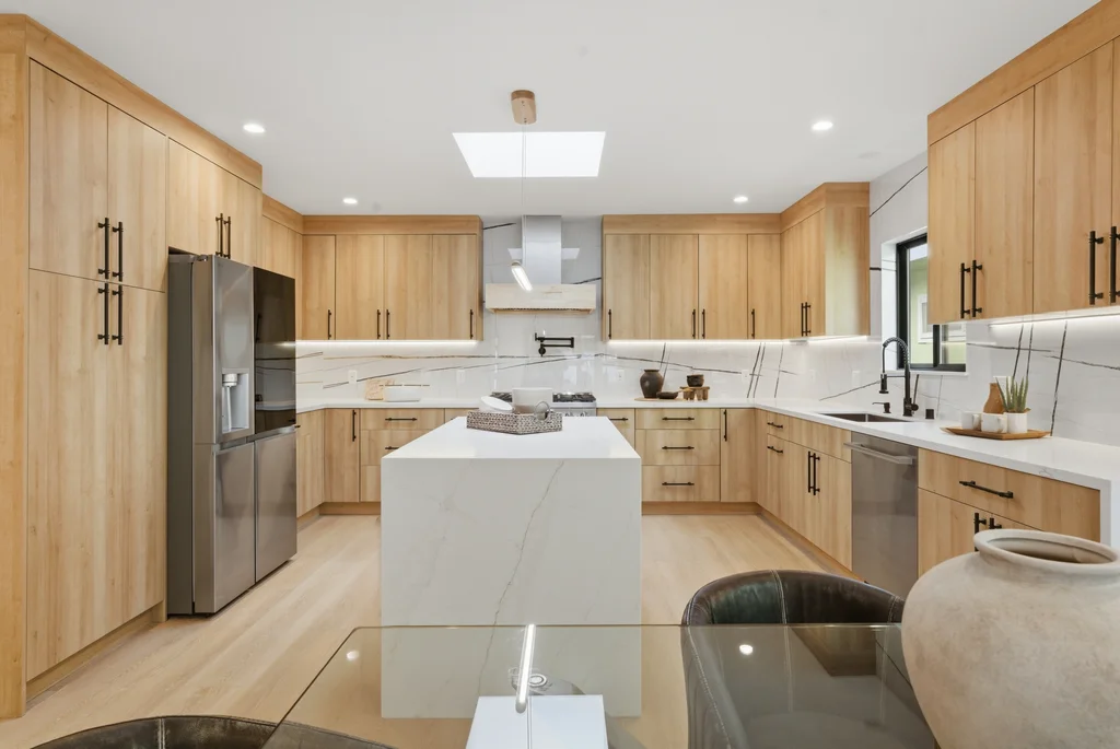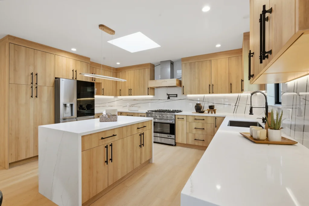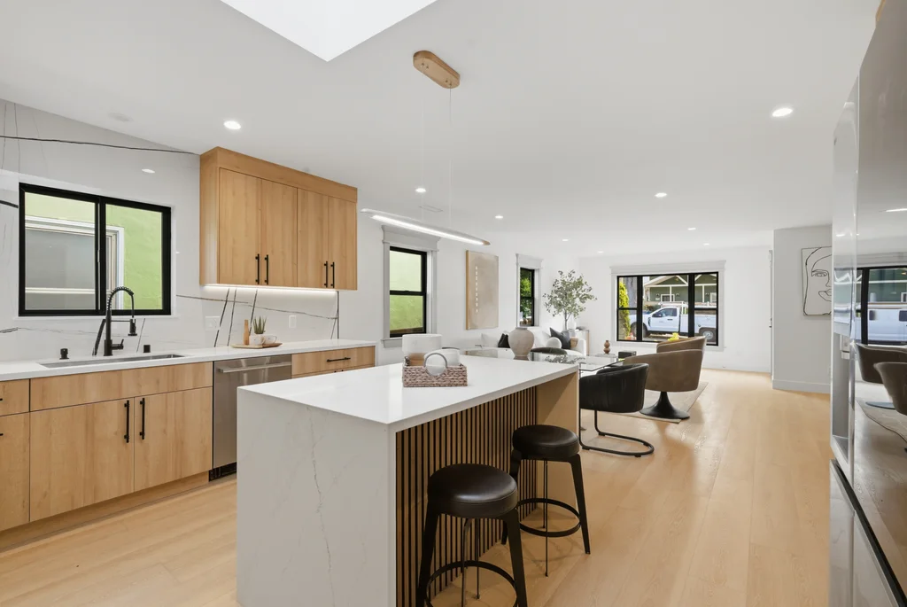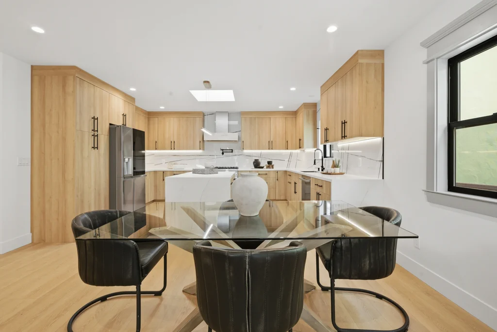 The heart of the home is the light-filled kitchen, highlighted by a skylight with a remote-controlled retractable shade that lets you tailor the ambiance at the touch of a button. A custom island anchors the space with pop-up power outlets and built-in USB connections—perfect for meal prep, casual dining, or working from home while staying connected. The kitchen is further elevated by sleek stainless steel appliances, including a striking 36-inch gas range designed for both everyday cooking and entertaining. Modern finishes and thoughtful functionality make this kitchen a true centerpiece of the home.