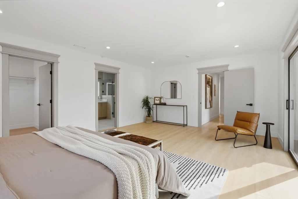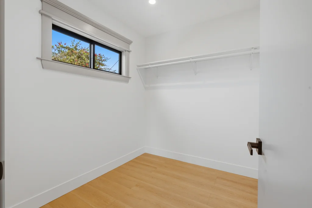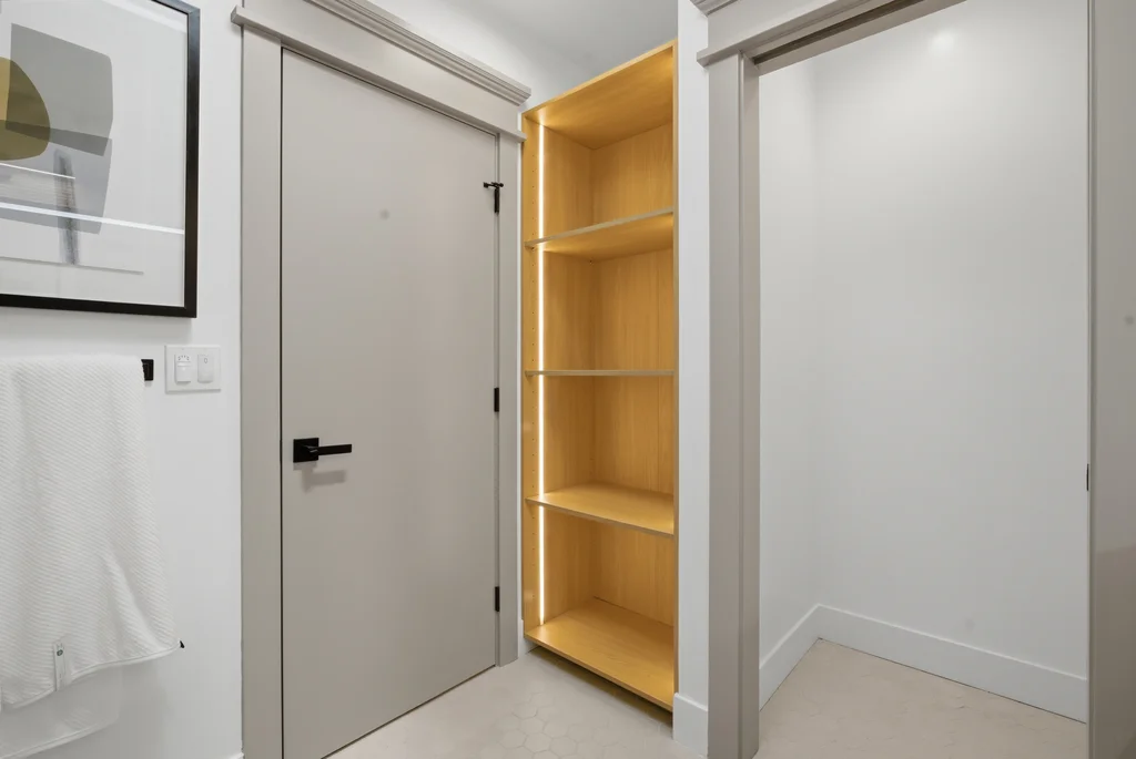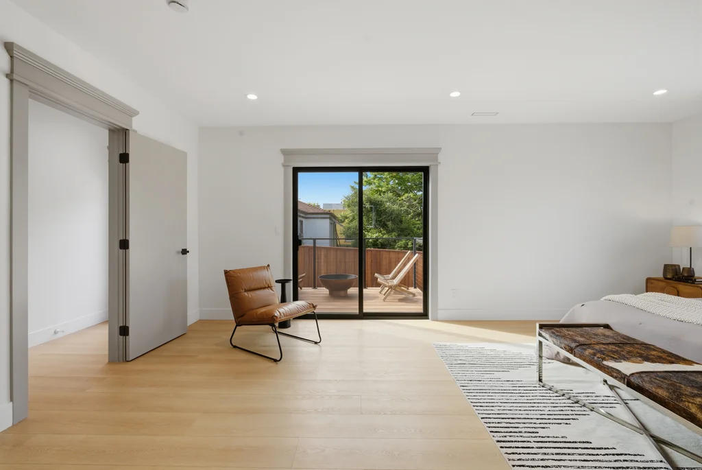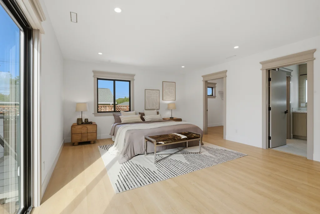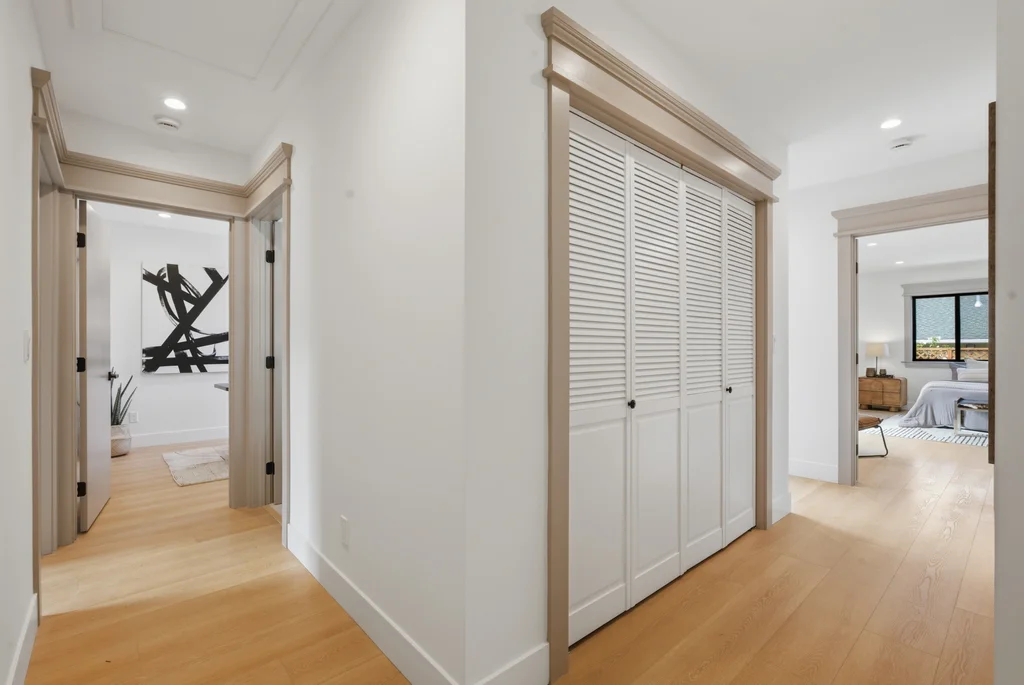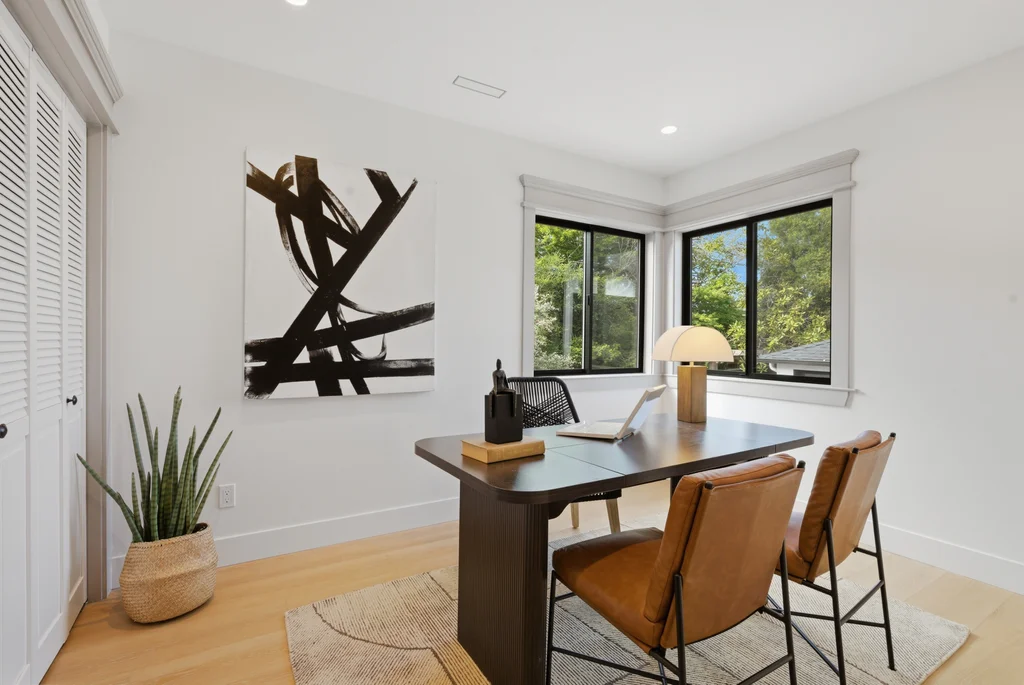 The heart of the home is the light-filled kitchen, highlighted by a skylight with a remote-controlled retractable shade that lets you tailor the ambiance at the touch of a button. A custom island anchors the space with pop-up power outlets and built-in USB connections—perfect for meal prep, casual dining, or working from home while staying connected. The kitchen is further elevated by sleek stainless steel appliances, including a striking 36-inch gas range designed for both everyday cooking and entertaining. Modern finishes and thoughtful functionality make this kitchen a true centerpiece of the home.